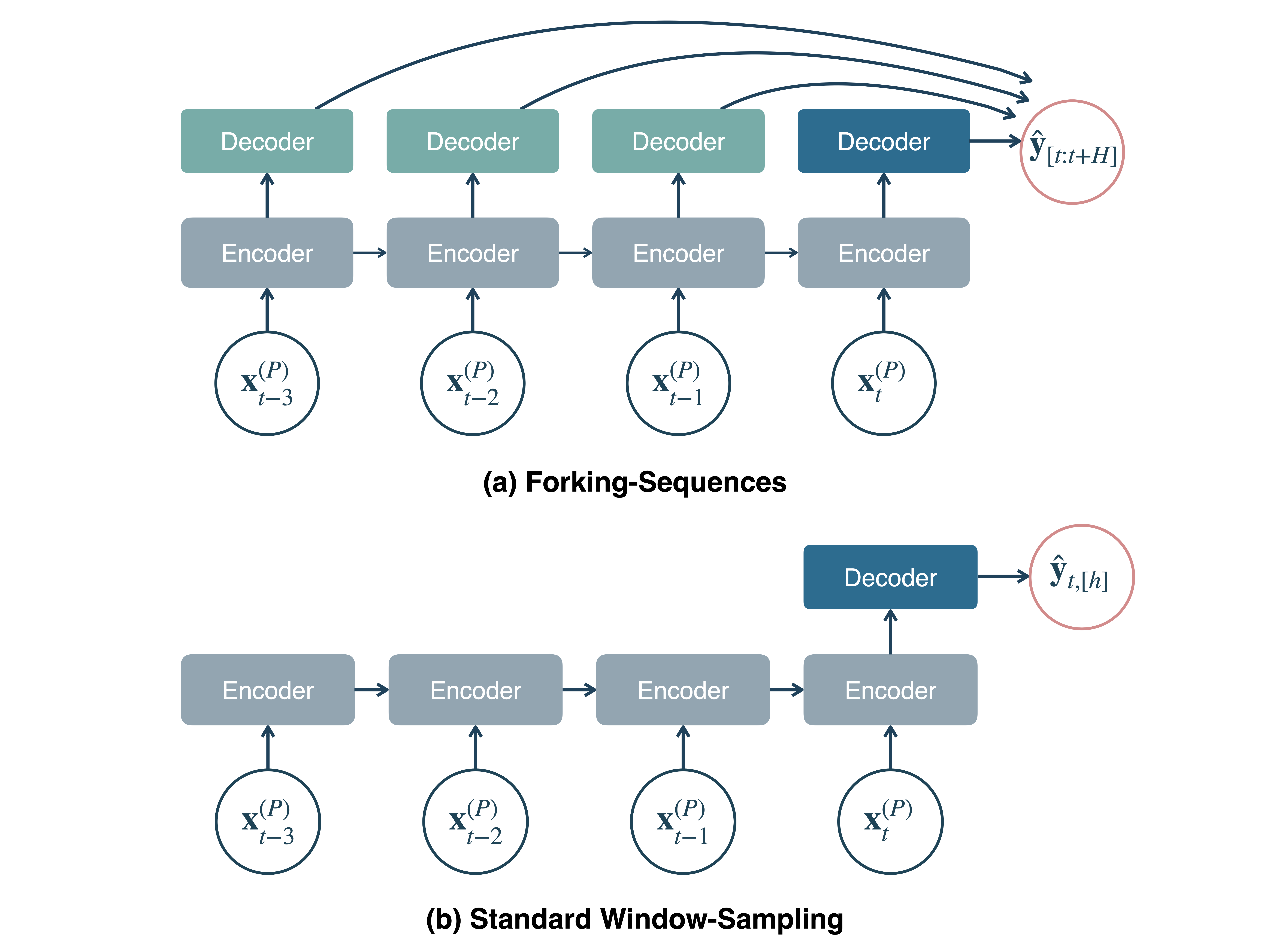 Unlike standard statistical and neural forecasting methods that treat each FCD independently, the forking-sequences method jointly encodes and decodes the entire time series across all FCDs. We formalize the forking-sequences approach and advocate for its broader adoption, demonstrating three key benefits: (i) more stable and consistent gradient updates during training; (ii) reduced forecast variance through ensembling; and (iii) improved computational efficiency during inference.